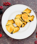 Cornetti di frolla ripieni di confettura ai frutti di bosco, fatti a mano. Ogni confezione contiene 12 cornetti da 60g circa l'uno.