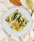 pasta all'uovo di nostra produzione (Semola e Semola rimacinata di Grano duro, Uova pastorizzate) (30,9 %), Besciamella (Latte, Farina di frumento tipo 00, Margarina -100% vegetale), Zucchine (18,5 %), Carciofi (12,3 %), Spinaci (6,2 %), Polpa di Pomodoro, Formaggio Grana DOP (latte di mucca pastorizzato, caglio, sale. Conservante: lisozima da uovo), Edamer (latte vaccino, fermenti lattici, sale, caglio)