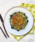 Burger di verdure ricoperto di semi di lino croccanti. Contorno di cicoria piccantina... 250g di leggerezza, 100% vegetale!