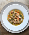Mix di molluschi e crostacei (Molluschi 80% (cozze, vongole, totani, calamari); Crostacei 20% (gamberi sgusciati), acqua, sale, correttore di acidità: E 330, e 500) (30,5 %), Verdure in Proporzione Variabile (Patate, Carote, Zucchine, Pomodori, Piselli, Fagioli Borlotti, Fagiolini, Cavolfiori, Sedano, Porro, Spinaci, Prezzemolo, Basilico) (26,7 %), Cous Cous (semola di grano duro) (19 %), Acqua di cottura (Acqua (99,2 %), Sale (0,8 %)), Brodo di Carne (Petto di Pollo, Carne di Bovino (35,7 %), Zucchine, Acqua, Carota, Cipolla, Pomodori, Patate, Sedano, Pepe nero, Sale fino), Olio extra vergine di oliva, Olio di semi di girasole, Sale fino, Prezzemolo, Pepe nero, Aglio