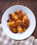 Patate, Ricotta (siero di latte vaccino con aggiunta di latte, sale, correttore di acidità E330.), Patate al naturale a cubetti (Patate, sale(<0,1%)), Fagioli, Semola e Semola rimacinata di Grano duro, Salmone Norvegese affumicato (Salmone, sale) (8,2 %), Polpa di Pomodoro (Pomodoro 99,2%, Acido Citrico), Olio extra vergine di oliva, Cipolla, uova fresche pastorizzate, Grana Padano DOP (latte, caglio, sale, conservante: lisozima (uova)), pangrattato (Farina di grano duro tipo 00 (50,8 %), Acqua, Sale, Farina di frumento tipo 00 (0,5 %), Lievito di birra), Olio di semi di girasole, Sale fino, Burro (latte), Sale e Pepe (Sale fino (99 %), Pepe nero (1 %)), vino bianco, Pepe nero Il prodotto può contenere: crostacei, frutta a guscio, molluschi, sedano, senape, soia